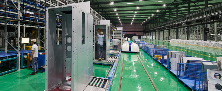 數(shù)字化工廠占地面積185畝,建筑面積5.8萬平方米,共分兩個(gè)生產(chǎn)車間,中壓成套生產(chǎn)車間和低壓成套生產(chǎn)車間,主要設(shè)備和系統(tǒng)包括:配電設(shè)備柔性裝配線、鈑金柔性自動(dòng)化生產(chǎn)線、庫線一體化銅母線自動(dòng)加工線、二次線束自動(dòng)加工線,以及智能物流與倉儲(chǔ)系統(tǒng)、能源管理系統(tǒng)、綜合監(jiān)控系統(tǒng)、數(shù)字化檢測系統(tǒng)等,具備年產(chǎn)5萬面中低壓智能配電設(shè)備的能力,并實(shí)現(xiàn)公司產(chǎn)品在城市軌道交通等供電系統(tǒng)中的全壽命周期管理,成為聯(lián)通上游供應(yīng)商和客戶的數(shù)字化運(yùn)營平臺(tái)。